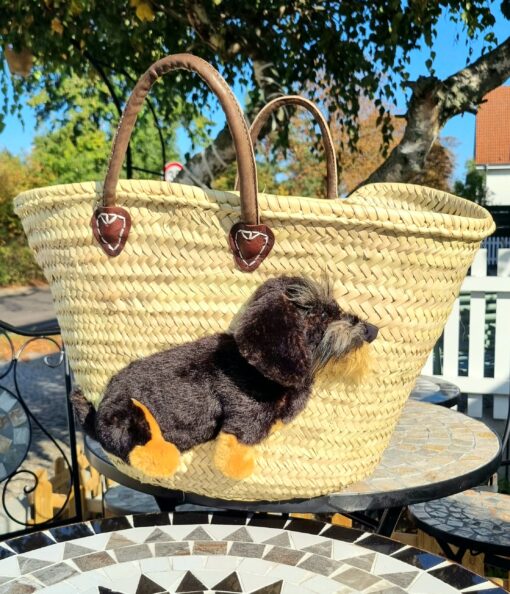 Große Korbtasche mit Rauhaardackel Oskar und Ledergriffen sowie innerer Ledertasche